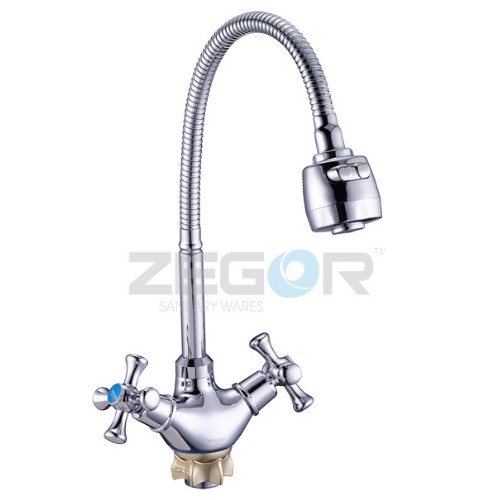 Технологія виробництва лиття під тиском, гусак гнучкий, оснащений кухонною лійкою, яка має два режими. Управління здійснюється поворотами двох вентилів. Сучасний дизайн з хромованим покриттям відмінно поєднуватиметься з дизайном будь-якої кухні. Зносостійкість матеріалів та стійкість до хімічних речовин покриття забезпечать довгу, безперебійну роботу приладу, який повністю виправдає витрачені на нього кошти.